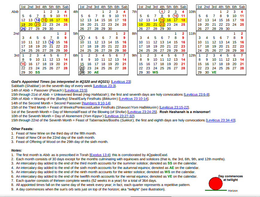 Frag. 1 “the Passover is on the fourteenth of the month on the third day (of the week). On the eighteenth of the month is the Sabbath of Yehoiarib. Passover ends on the third day in the evening.“ 4Q325 [Ibid] Page 403 Priestly Service: Sabbath, Month, and Festival – Year One All Sabbaths and holidays on Israelite calendar can cross-referenced with these and many other scriptures